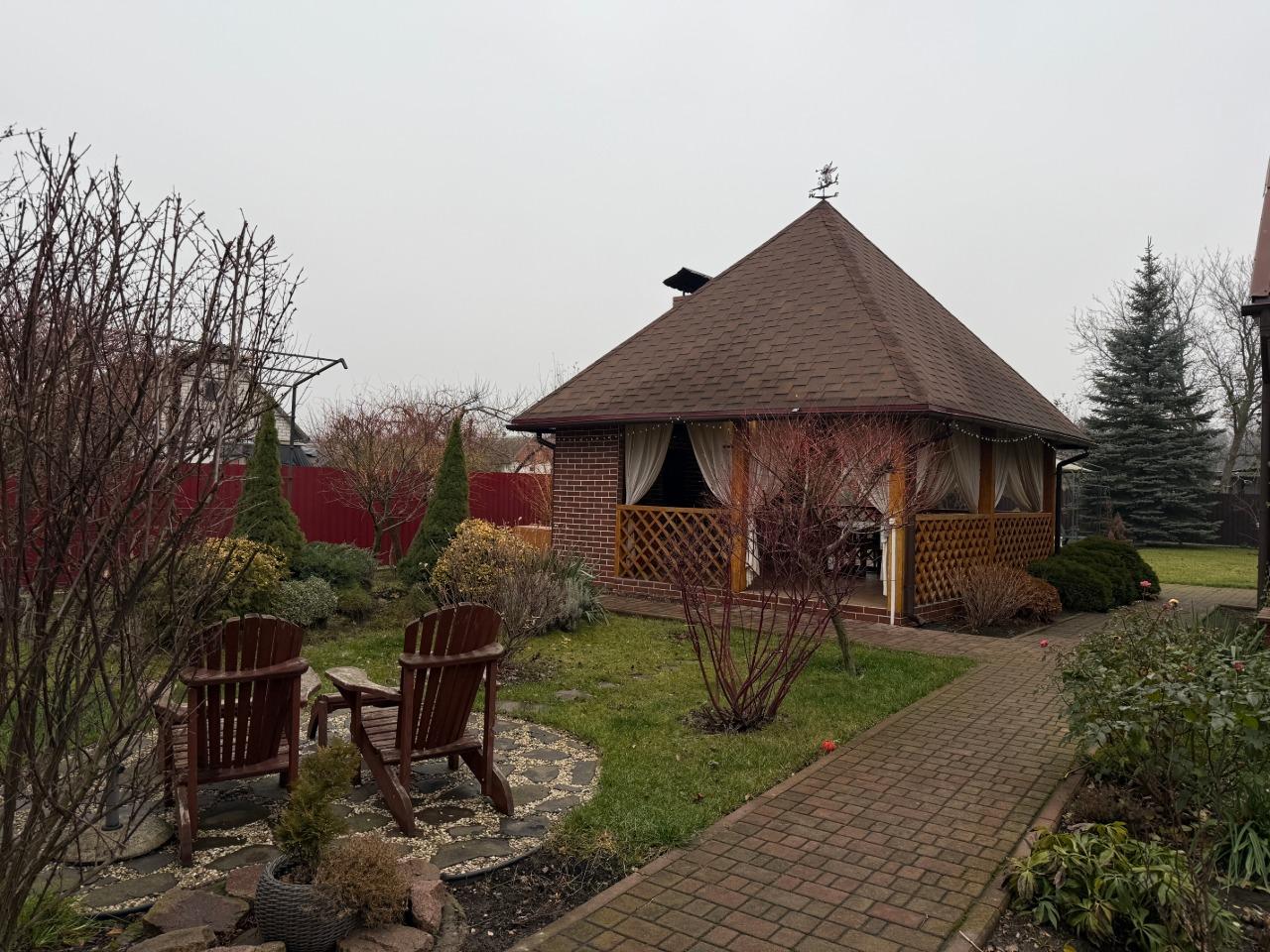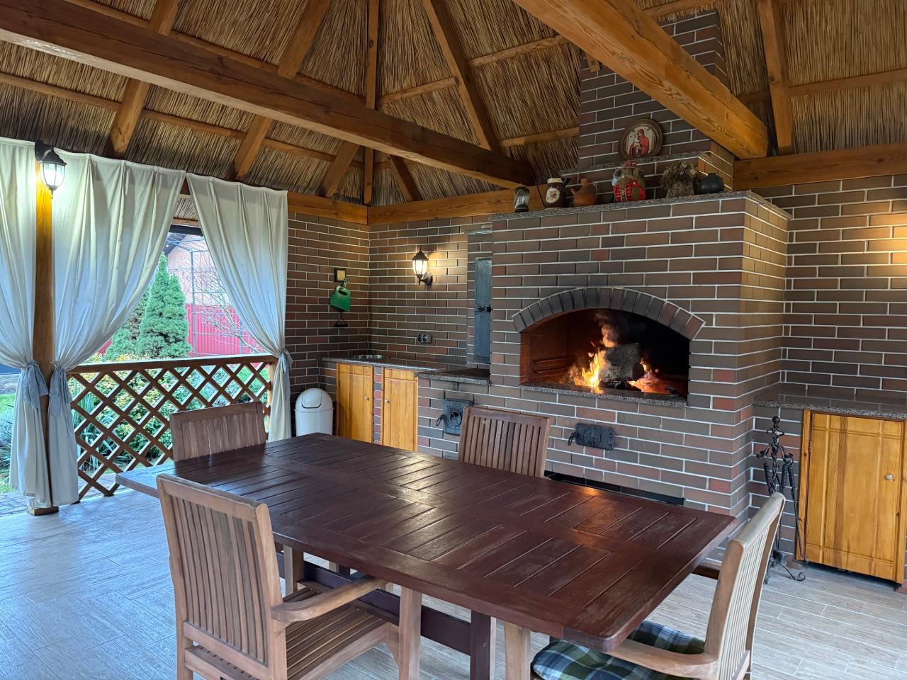 На території будинку розташована простора альтанка площею 35 м² з міцним дубовим каркасом. Усередині облаштовано мангал, коптильню та казан — ідеальне місце для сімейного відпочинку та зустрічей з друзями.